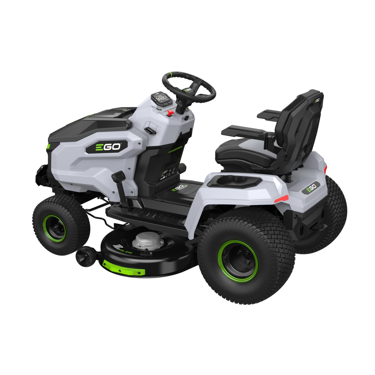 Die neuen EGO Rasentraktoren setzen den Standard unter den akkubetriebenen Heckfängern und Seitenauswerfern. Die leistungsstarken Doppelmesser und die Decks aus gepresstem Stahl sorgen dafür, dass die Mähwerke robuste Leistung mit effizienter Grasaufnahme in der Grasfangbox am Heck des Mähers oder mit schnellem Seitenauswurf. Das zentrale LCD-Kontrolldisplay befindet sich auf dem Armaturenbrett und ermöglicht eine einfache Einstellung der Fahr- und Schnittgeschwindigkeiten. Die Bluetooth-Verbindung ermöglicht es dem Benutzer, die Geräteleistung und ebenso den Ladezustand der Akkus zu überwachen. So stellen Sie sicher, dass die Akkus aufgeladen und bereit sind.